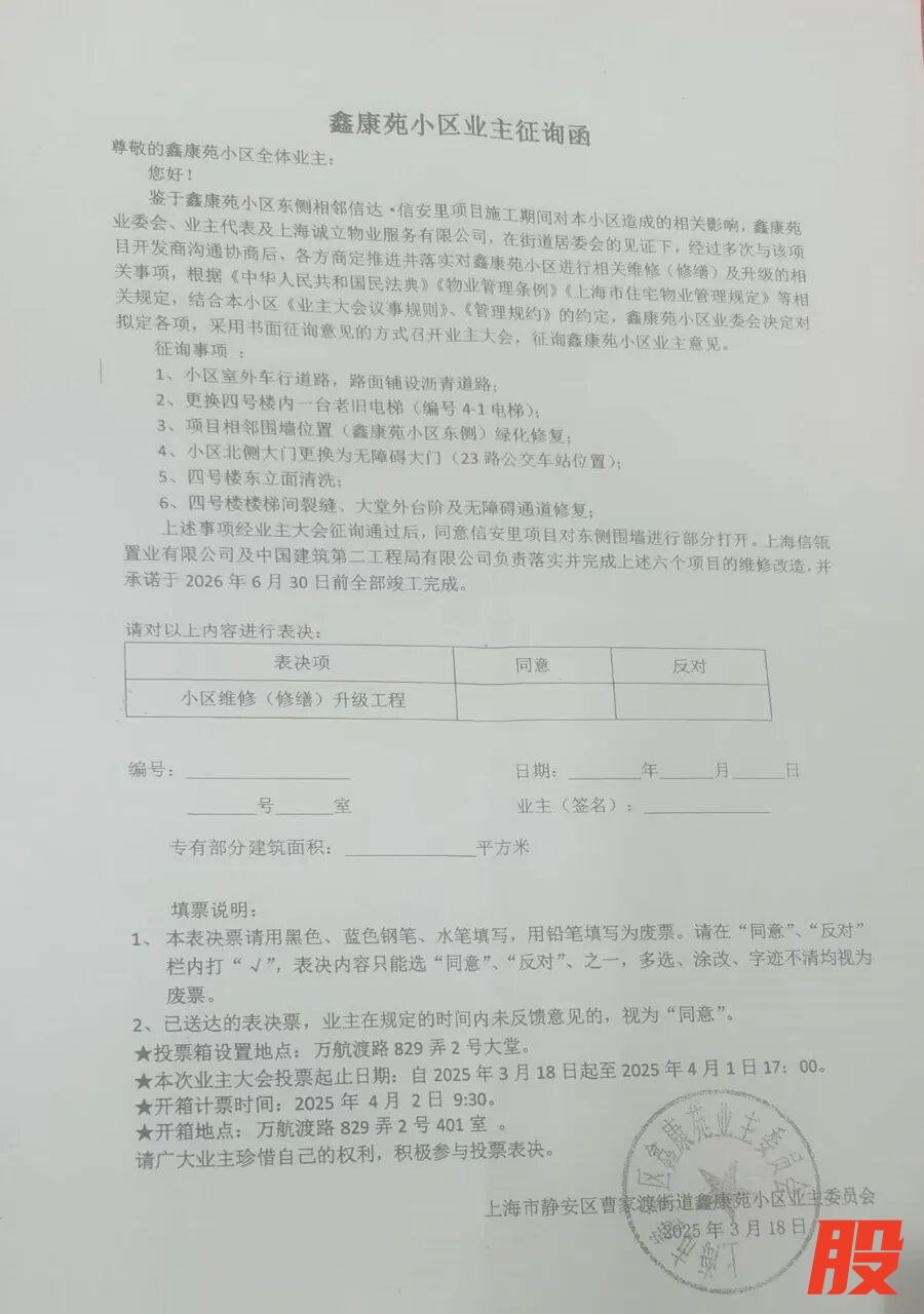 今年3月,鑫康苑发起了一项全体业主征询,起因是旁边的信安里项目施工期间对小区造成了一些影响,拟进行相关维修(修缮)。征询内容包括6项:更换4号楼内一台老旧电梯;4号楼东侧与信安里相邻围墙位置的绿化修复;4号楼东立面清洗;4号楼楼梯间裂缝、大堂外台阶及无障碍通道修复等。